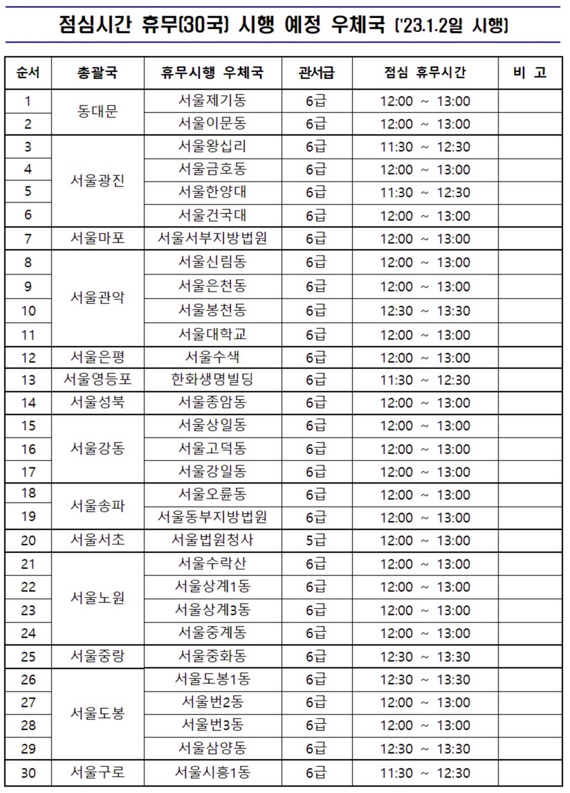 2. 2023년부터 점심시간 휴무 시행 예정인 서울지역 우체국