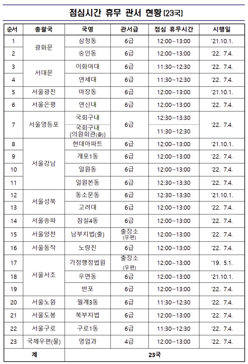 위 표는 2022년 12월 현재 서울지방우정청 홈페이지에 나와있는 점심시간 휴무제를 시행하고 있는 우체국입니다. 서울 전 지역에서 23개의 우체국에서 시행하고 있습니다. 주로 법원이나 대학의 출장소 위주로 1차 시행한 것으로 보입니다.