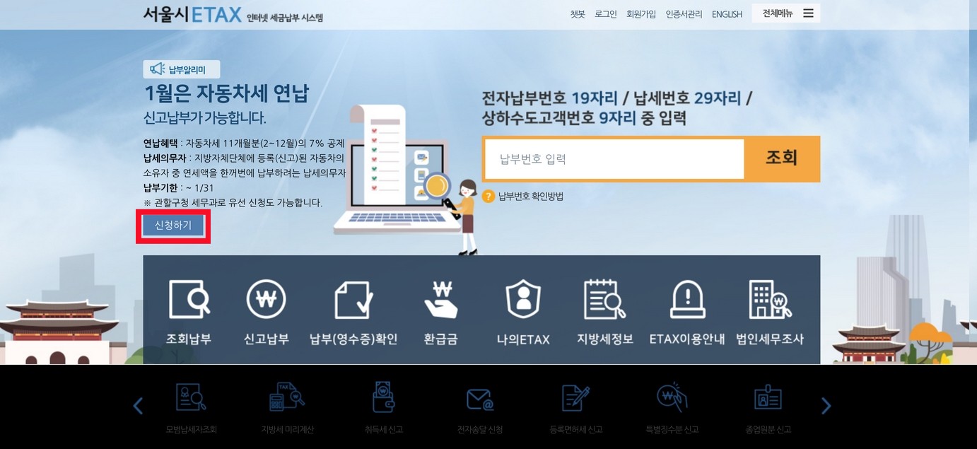 메인 화면에서 자동차세연납신청 버튼 눌러주시면 됩니다. 1월초 현재 지금은 납부기간이 아니어서 아직 활성화 되지 않았고, 납부기간이 되면 활성화 될 것으로 보입니다. 절차는 서울시 이택스와 비슷합니다.